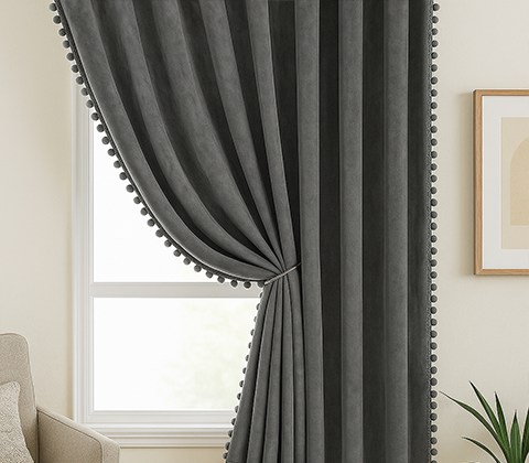 KNOTTING HOME Velvet Eyelet Door Curtains with pom pom Lace for Living Room Bedroom Kitchen in Grey Color